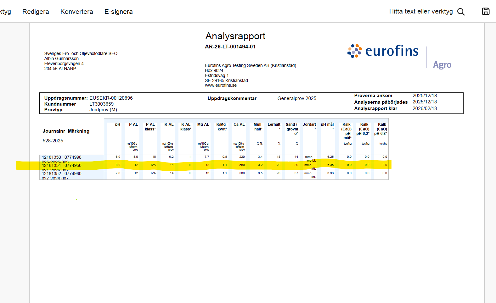 | P01: Vid anläggning | 2026-02-13 | pH | | 8 |