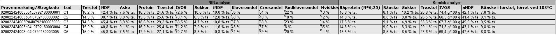 TØRSTOF, IALT % af råvare | RÅPROTEIN, IALT % af tørstof | TRÆSTOF, IALT % af tørstof | RÅASKE, IALT % af tørstof | SUKKER, IALT % af tørstof | KG TØRSTOF, IALT /f.e. | FK, IALT organisk stof (korrigeret) |