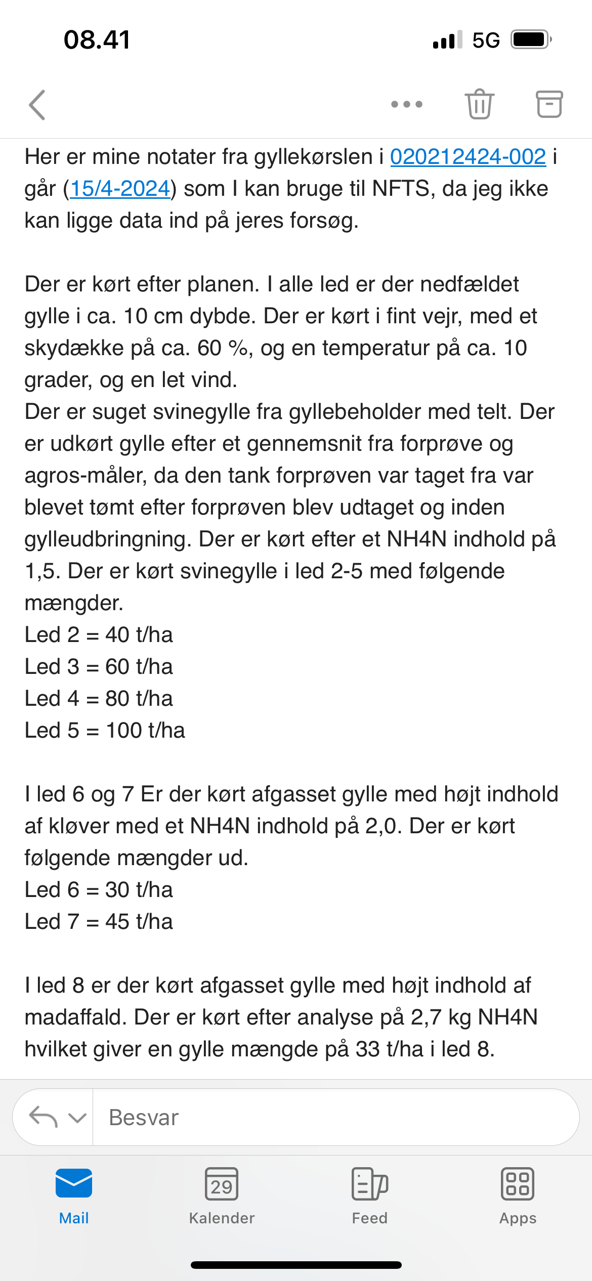 | 5 | 1 | Før såning | 15-04-2024 | 00 | 150 kg NH4-N | 100 t Gylle, svin | 268,8 | 30,96 | 209,04 | | | 2611-2 | L |