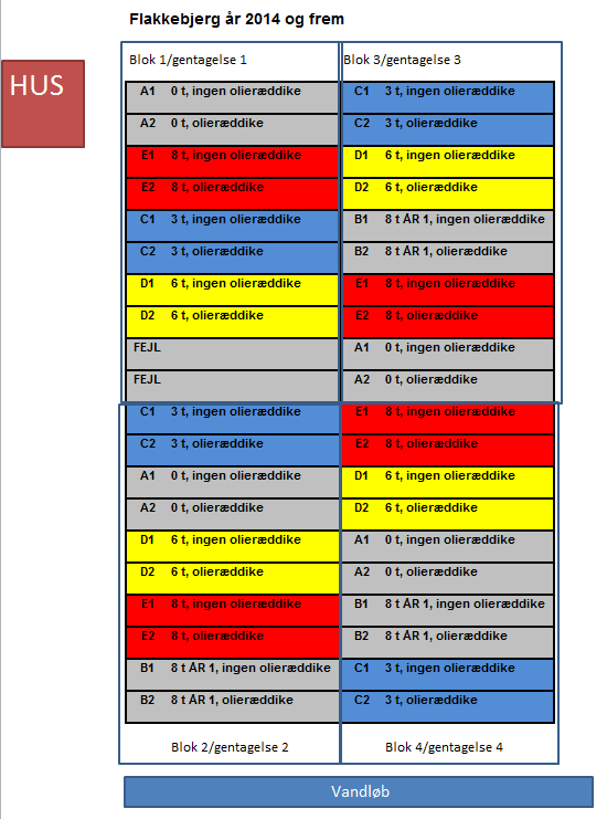| DESIGN DATA: Split-plot, 2 faktorer, 4 Gentagelser. Parcelfordeling: systematisk. Anlægsparcel minimum 150m2. Høstparcel minimum 90m2. |