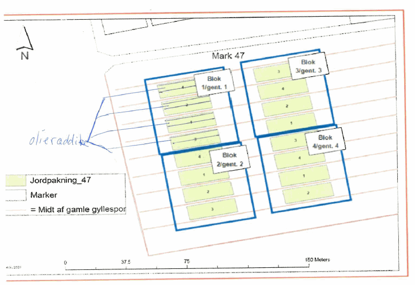 | ANLÆGSDATA: Parcellerne er 30 m lange og ca. 10 m brede. Fra 2013, høst, er de opdelt i to, og der er sået olieræddike i den ene halvdel.