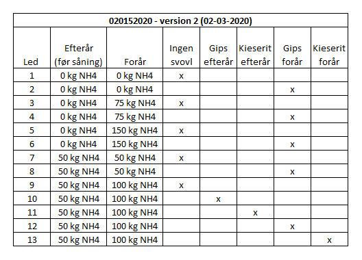 | 03-03-2020 | I forsøgsbehandlinger er kieserit ændret til naturgips i led 2, 4, 6 og 8 (ABV). |