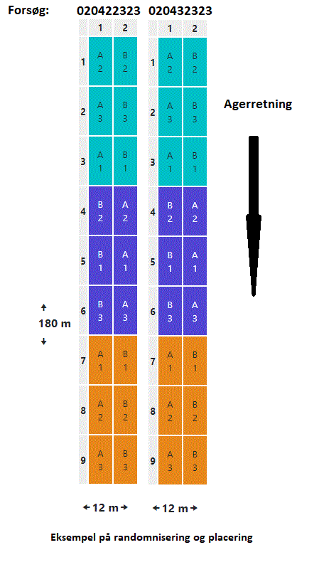 | DESIGN DATA: Split-Block, 2 faktorer (Randomiseret), 3 Gentagelser. Parcelfordeling: Split-Block. Anlægsparcel minimum 120m2. |
