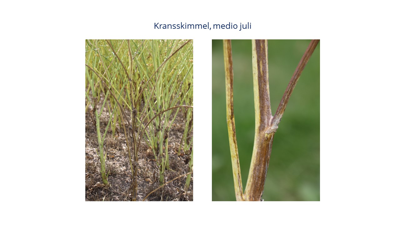 KRANSSKIMMEL: Primo til medio juli ses ensidig visning ved angreb af kransskimmel. Efterhånden bliver planterne helt nødmodne, og det er sværere at afgøre årsagen til nødmodningen. Se billeder med eksempler på angreb nederst under afsnittet Skitser.