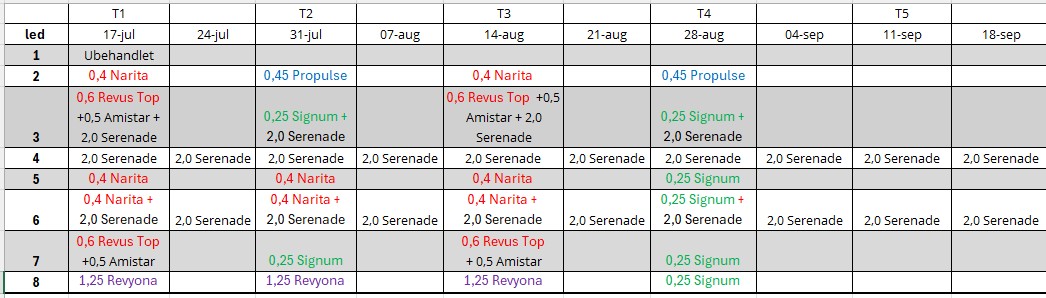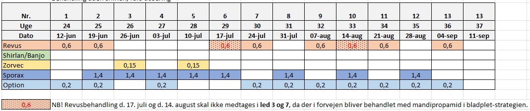 | 25-04-2025 | Grundet usikkerhed om PFAS-midler er led 3 ændret fra at være Narita/Propulse behandlinger sammen med Serenade ASO til at være Revus Top+Amistar/Signum behandlinger sammen med Serenade (HJB) |