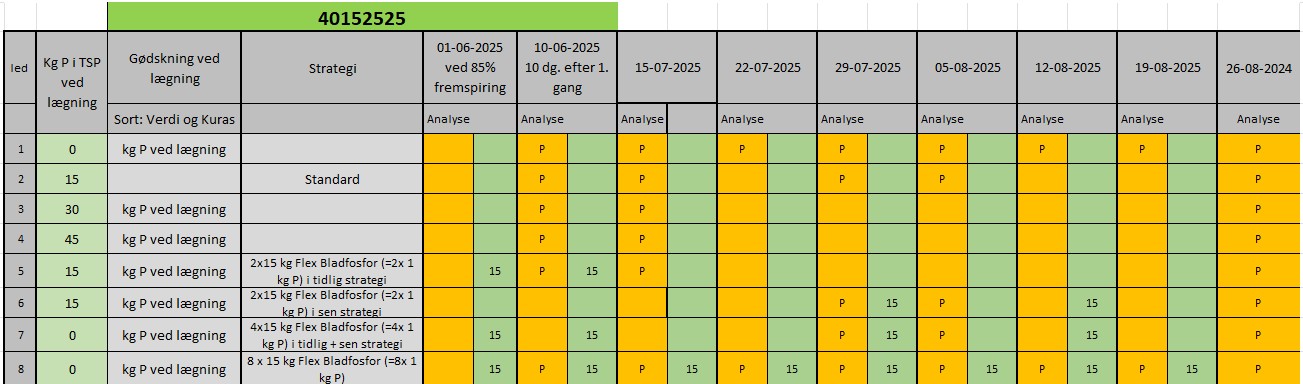| P03 | 10-06-2025, 7 dage efter behandling, Før gødskning Alle målinger i P03 udføres kun i led: 1, 2, 3, 4, 5, 8 Alle målinger i P03 udføres kun i gentagelse: 2 |