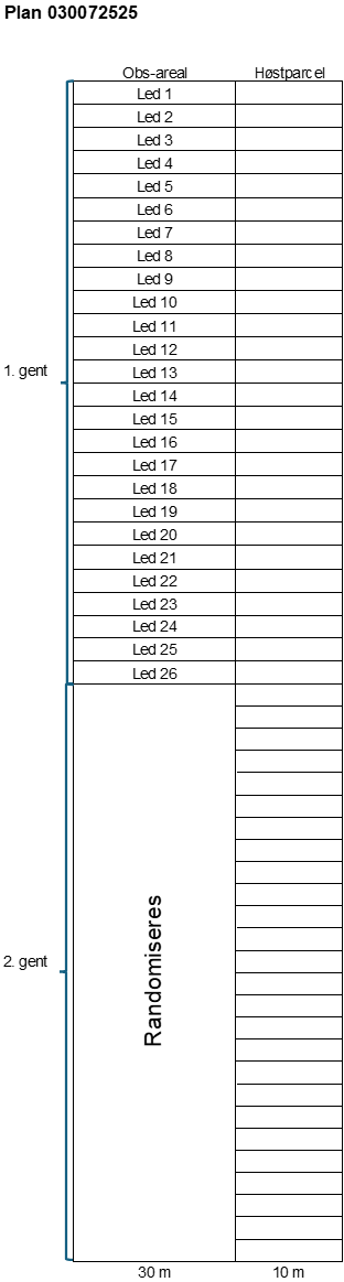 VEJLEDNING TIL FORSØGSBEHANDLING: Etablering: Forsøget udlægges uden dæksæd inden 20. august på nypløjet jord, der er pakket og tilberedt til såning. Der skal sås inden for 6 til 10 timer, så jorden ikke udtørres. Forsøget skal sås med småparcelteknik evt. ved hjælp fra Teknologisk Institut eller Ytteborg. Sådybde er ca. 0,5-1,0 cm. Forsøgsarealet SKAL være meget jævnt og tromlet fast inden såning af udlæg. Der udføres ikke forsøgsbehandlinger (slæt) i udlægsåret 2025. Udsædsmængden er for led 1-2: 26,2 kg, for led 3-4: 34,2 kg og led 5-26: 28 kg pr. ha. I udlægsåret skal afgrøden være veltrimmet ved slæt inden vinter, arealet må ikke afgræsses. Der må kun køres med parcelhøster eller lignende, der ikke laver spor i parcellerne (se det vedlagte foto).